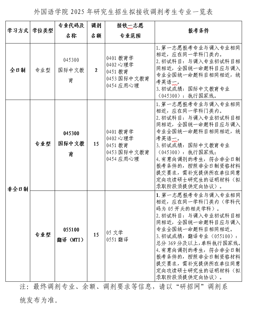 2.原则上,调剂考生第一志愿报考专业与调入专业相同相近,或初试科目与调入专业初试科目相同相近。各专业具体要求见上述《外国语学院2025年研究生招生拟接收调剂考生专业一览表》。