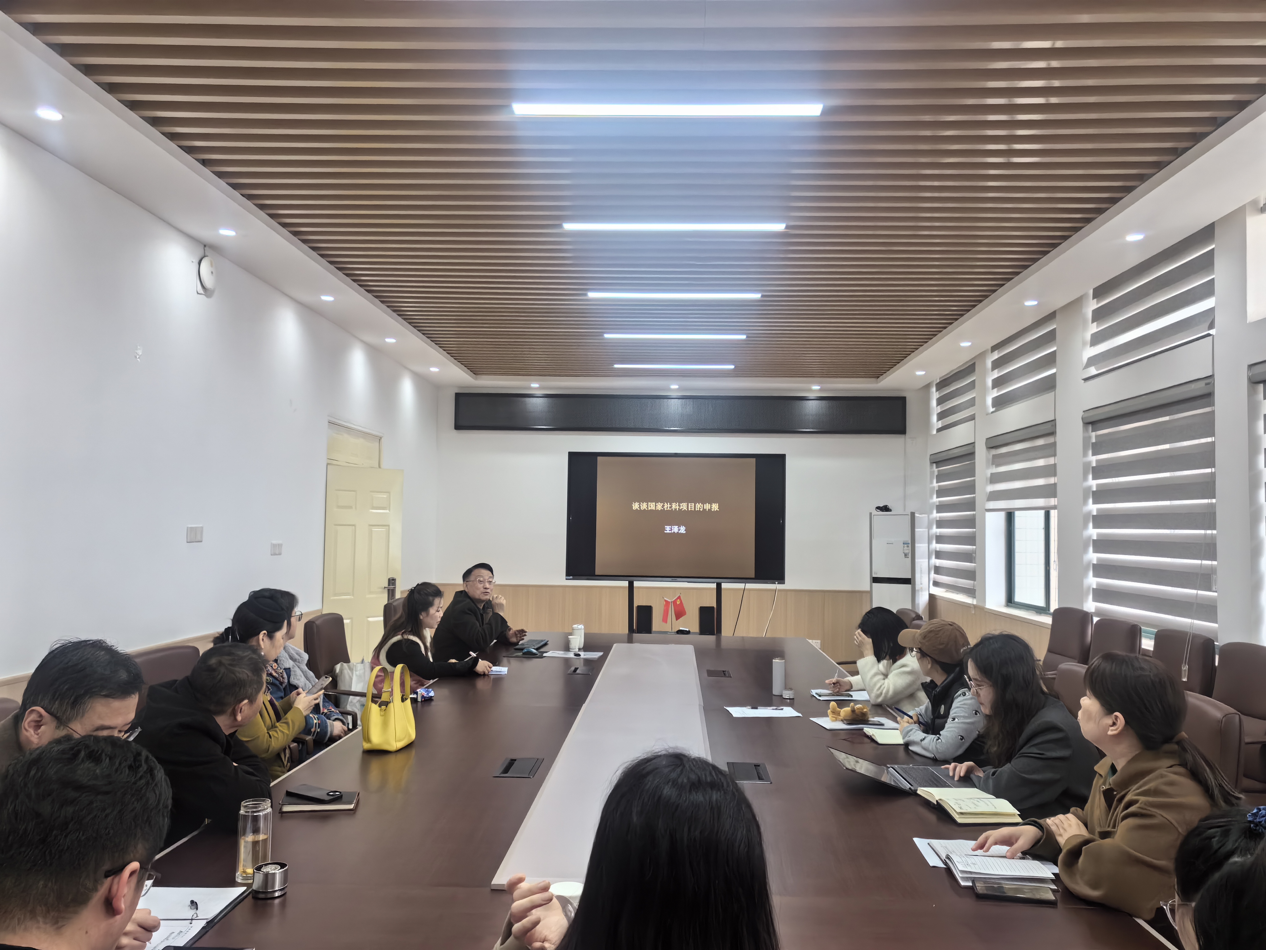 为进一步做好2026年度国家社会科学基金申报工作,不断提高申报质量,10月30日下午,学院特邀华中师范大学王泽龙教授在文科楼1001为老师们作了2026年人文社科类国家级项目申报辅导。王泽龙教授以“新形势背景下国家社科基金项目申报”为主题,结合多年评审经验,基于2025年国家社会科学基金年度项目立项情况,分析了各立项类型数量、学科比例,探讨申报项目的选题原则,解读项目申报的程序,并指导了老师们提交的项目书。