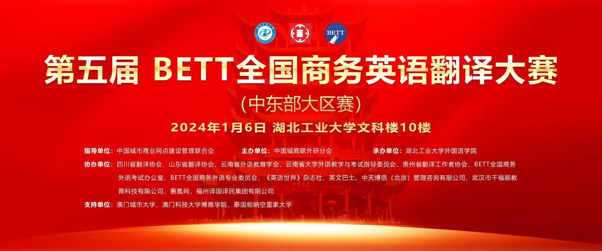 2024年1月6日,第五届BETT全国商务外语翻译大赛(中东部大区赛)在湖北工业大学圆满落幕。来自全国各地的高校学子,以及业界精英们汇聚一堂,展示了自己的专业技能和深厚实力。本次大区赛由中国城市商业网点建设管理联合会指导,中国城商联外研分会主办,湖北工业大学外国语学院承办。