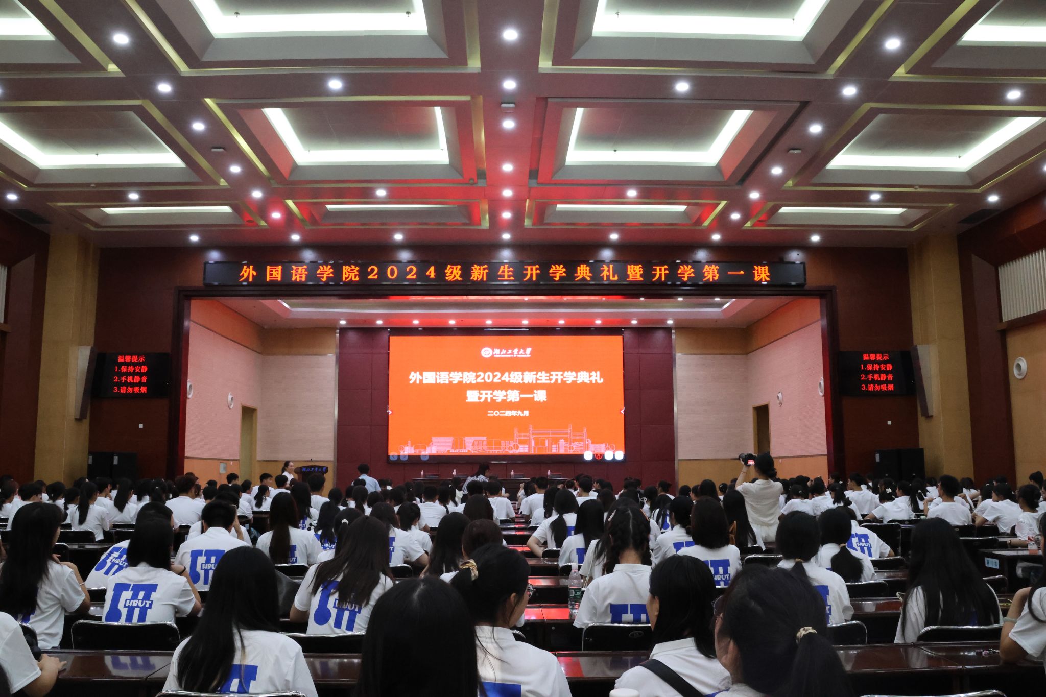 9月14日下午,外国语学院在图书馆报告厅隆重举行2024级新生开学典礼暨开学第一课。院党委书记张志国,院长鲁修红,院党委副书记胡文敏,副院长黄广芳、李池利参加典礼。各系部、中心负责人、新生班导师、行政教辅教师代表、2024级全体本科和研究生新生到场参加。典礼仪式由院党委副书记胡文敏主持。