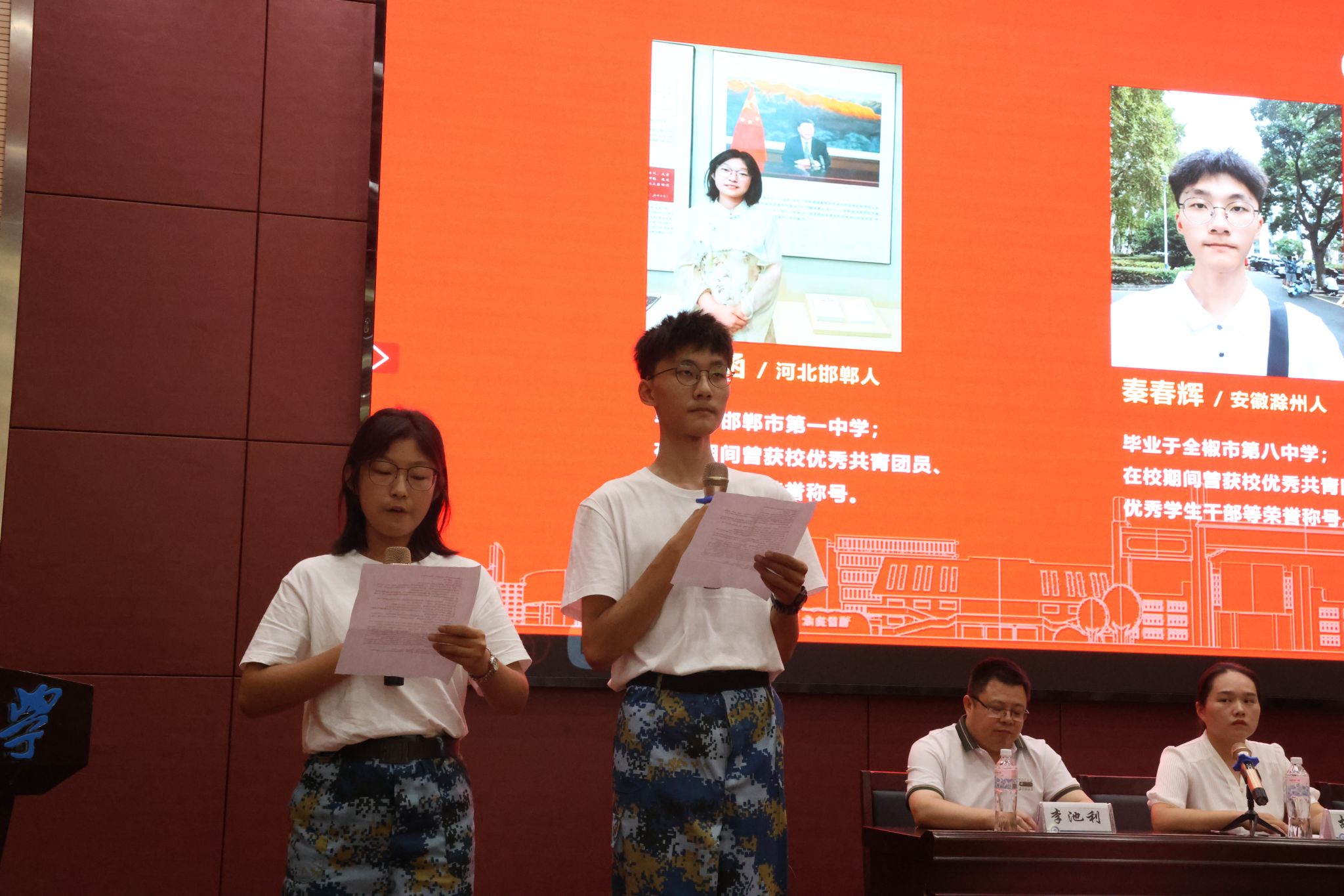 接着,24级本科新生娄京函、秦春辉做代表发言。他们表达了对父母和老师无尽的感激与敬意,同时还展望未来的大学生活,希望能够探索自我、发展自我,期待在湖工大披荆斩棘、一路向前。他们将坚守家国情怀,立志肩负起新时代的使命,实现“今日我以湖工为荣,明日湖工以我为荣”的伟大志向。