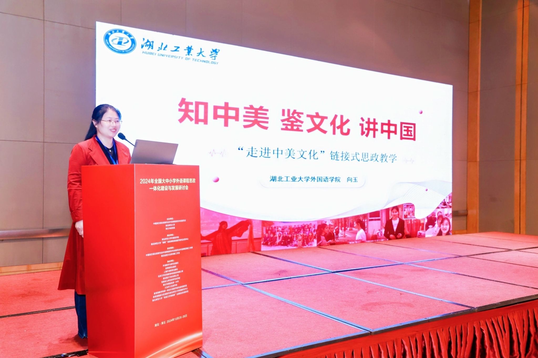 在会议的课程思政建设经验交流环节,向玉就其负责的湖北省一流课程、大学英语通识教育必修课程 “走进中美文化”进行了经验分享,展示了体现思政教育与外语课程教学的深度融合、基于CHAIN(链接式)的“内容链、方法链、场域链、评价链”四条思政链的教学创新与实践,赢得了与会专家和教师的高度认可。