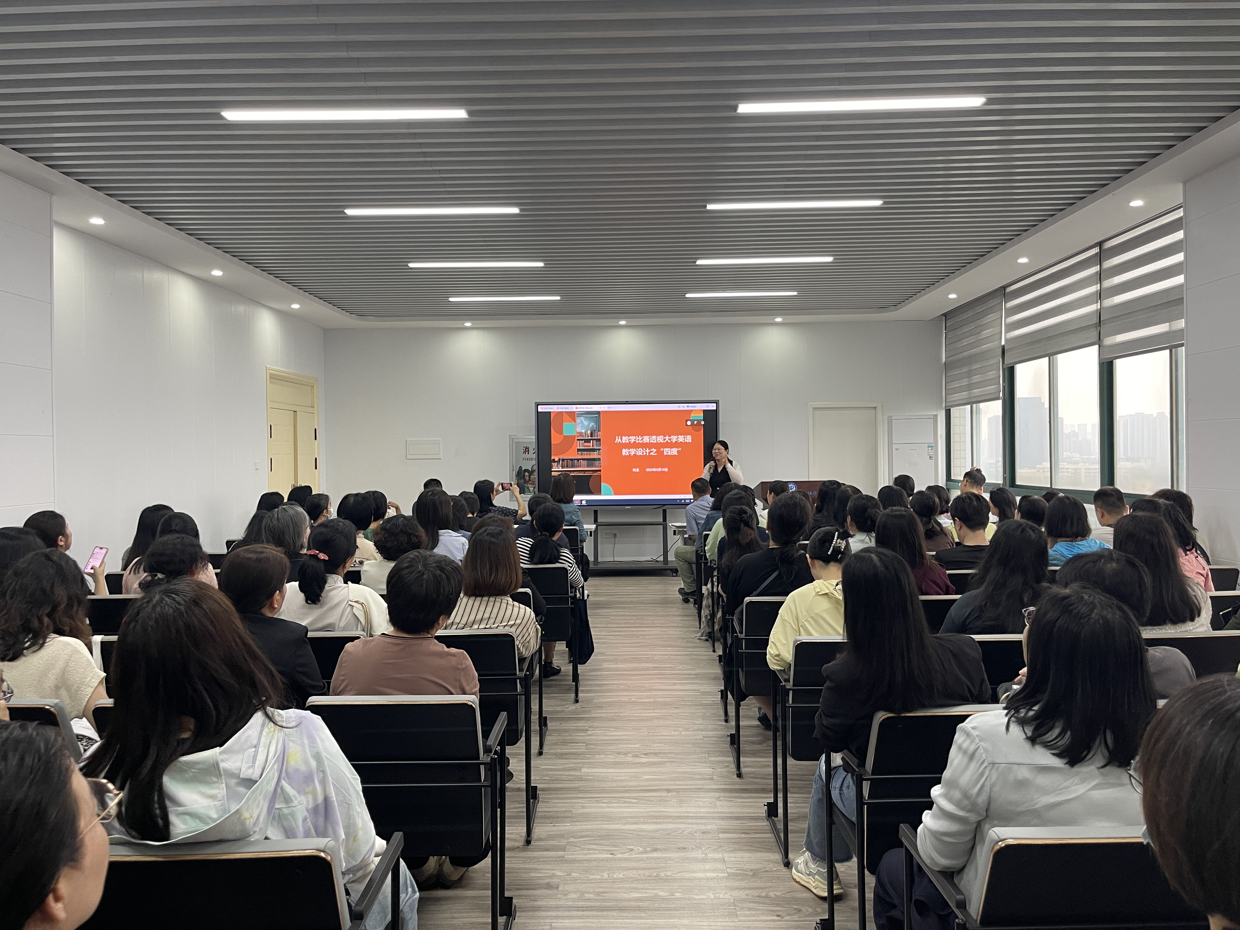 向玉老师以“从教学比赛透视大学英语教学设计之‘四度’”为主题,从理论阐释、价值剖析与实践路径三个维度,深度解构大学英语教学设计的核心逻辑。首先,向玉老师结合全国高校教师教学创新大赛、全国高校混合式教学设计创新大赛等权威赛事的教学设计方案要求,提炼出教学设计的本质内涵。谈及教学设计的战略价值,向玉老师强调其作为教学质量生命线的关键作用。科学的教学设计不仅能够系统梳理教学流程、精准定位教学目标,更能通过动态化教学策略激发学生学习主动性。针对大学英语教学设计实践,向玉老师提出大学英语教学设计需遵循“四度”原则,即教学内容的广度、教学对象的参与度、课程思政的温度及技术赋能的效度。