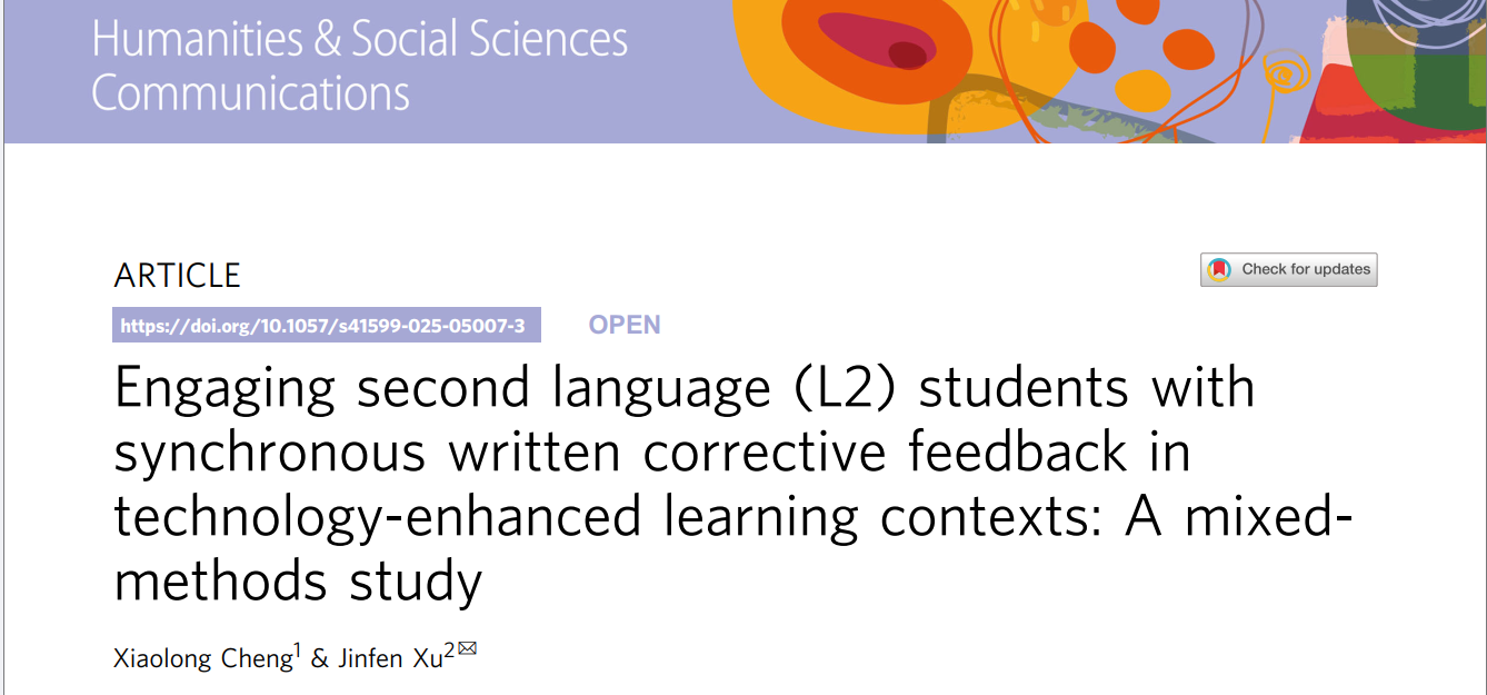 我院青年教师程晓龙副教授在Nature子刊《Humanities & Social Sciences Communications》 (《人文与社会科学通讯》)发表题为“Engaging second language (L2) students with synchronous written corrective feedback in technology-enhanced learning contexts: A mixed-methods study”的研究论文,程晓龙副教授为论文的第一作者,华中科技大学徐锦芬教授为通讯作者,湖北工业大学外国语学院为第一完成单位。