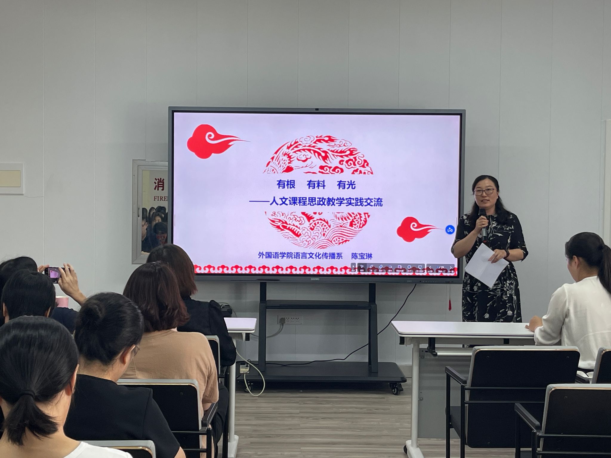 语言文化传播系教师陈宝琳围绕人文类课程思政教学实践主题进行分享。她提出,面对 AI 技术引发的技术理性与人文价值碰撞,人文学科需主动承担价值引领责任,服务学生全面成长。结合自身教学设计案例,她系统阐述了课程思政教学理念:一是“有根”,坚守“立德树人”根本使命,以教师的“大视野”唤醒学生的生命感知与价值认同;二是“有料”,拓宽人文知识教学边界,融入兼具深刻思想性与鲜明时代性的案例,精准回应学生的“现实关切”;三是“有光”,正视人才培养的“长期性”,在教学中推动经典内容的当代价值转化,实现学生“专业成长”与“精神成人”有机统一,彰显持久育人成效。