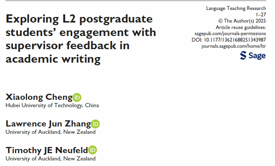 近日,学院青年教师程晓龙副教授与我校客座教授、新西兰奥克兰大学文学与教育学院Lawrence Jun Zhang教授以及Timothy Neufeld博士合作,在国际语言学顶刊《Language Teaching Research》(SSCI收录,中科院一区Top期刊)发表题为“Exploring L2 postgraduate students’ engagement with supervisor feedback in academic writing”的重要研究成果。湖北工业大学为该论文的第一完成单位,程晓龙副教授为论文的第一作者与通讯作者。