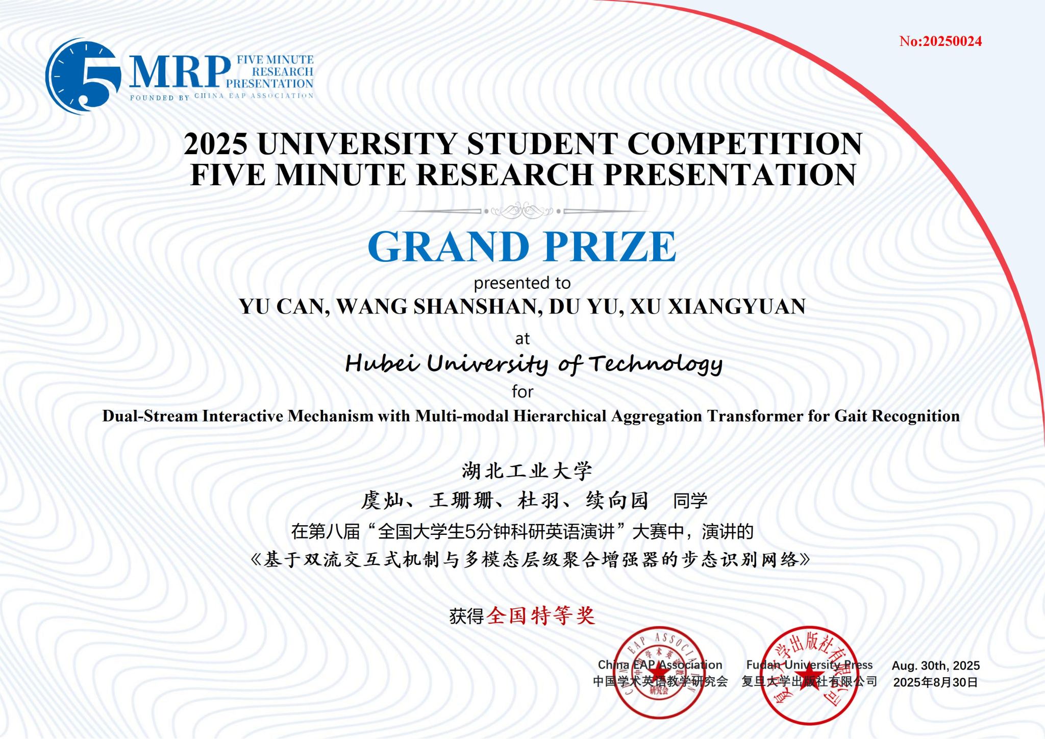 在近日结束的2025年第八届“全国大学生5分钟科研英语演讲大赛”全国总决赛中,我院研究生虞灿团队获得全国特等奖,这是我校自2018年以来第四次斩获该赛事最高奖项,充分体现了我校学生运用英语进行科研表达的综合能力。