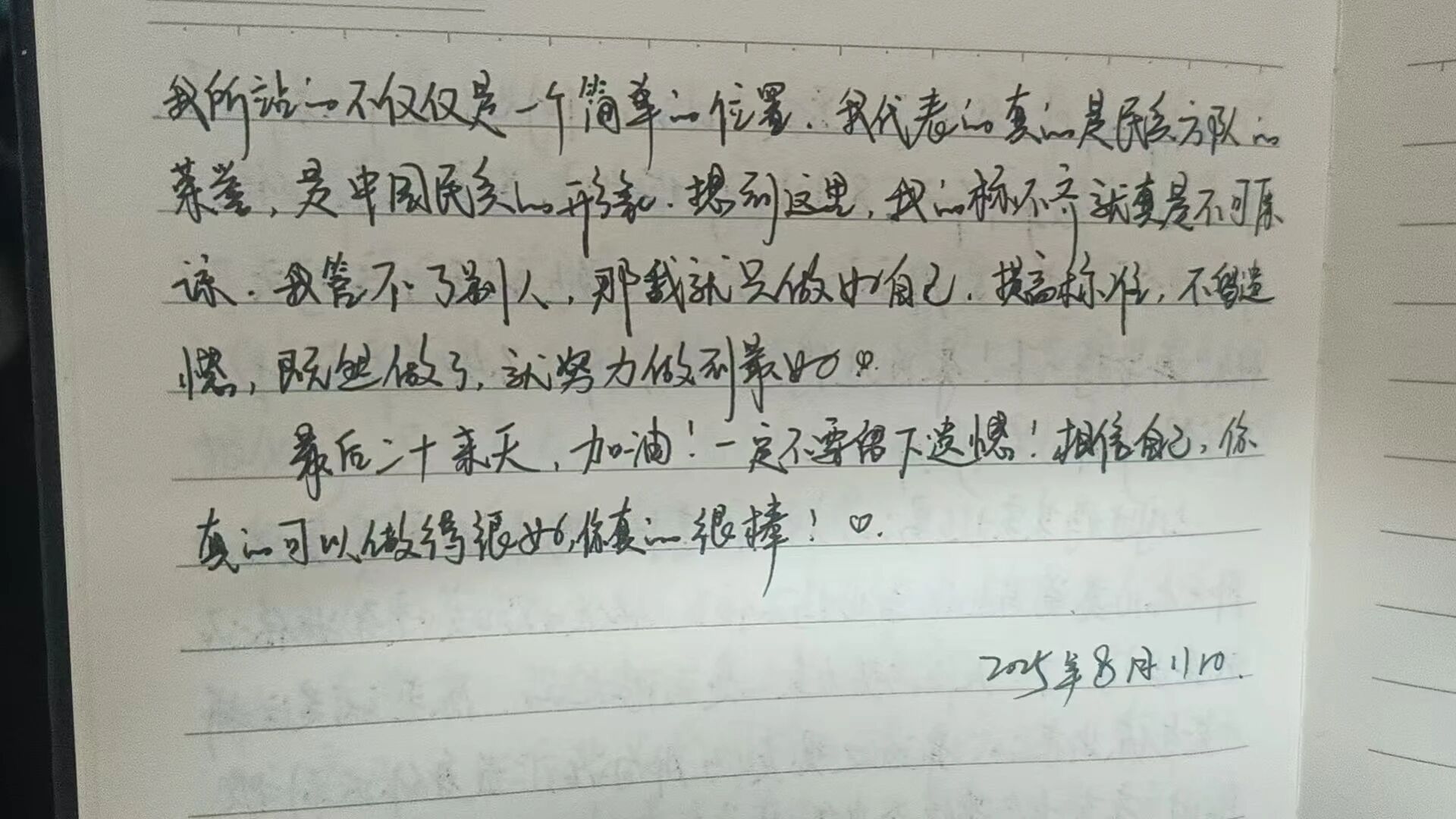 六个多月的高强度训练中,她每天与队友们重复数千次踢腿、摆臂、对正练习,脚掌磨破、膝盖酸痛成为常态。烈日下的军姿定型,汗水顺着帽檐滴落成线,却从未有人退缩。“三十厘米的踢腿高度,纹丝不动的身体控制——那不只是动作,是一种意志。”翟玉环这样形容训练中最难的一关。烈日下,她们就这样与标线为伴,帽檐、指尖、靴尖,每处细节都要精准落在线上。她曾在日记本里悄悄写下:“最后十来天,加油!一定不要留下遗憾!” 那些晒出分界线的皮肤、深夜加练的身影,都成了这段旅程中无声的见证。
