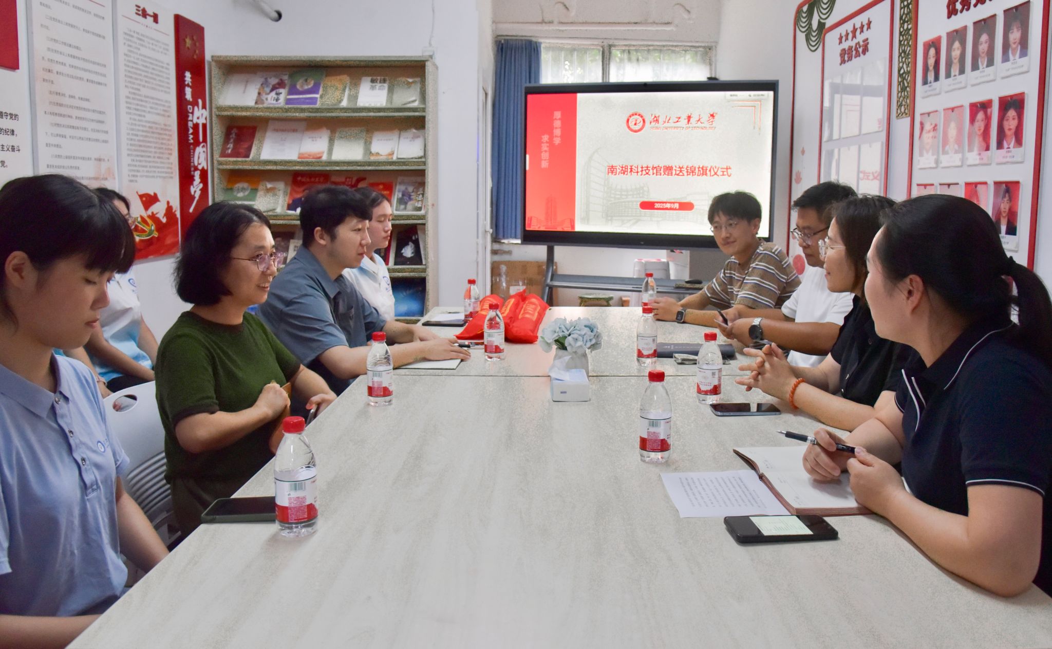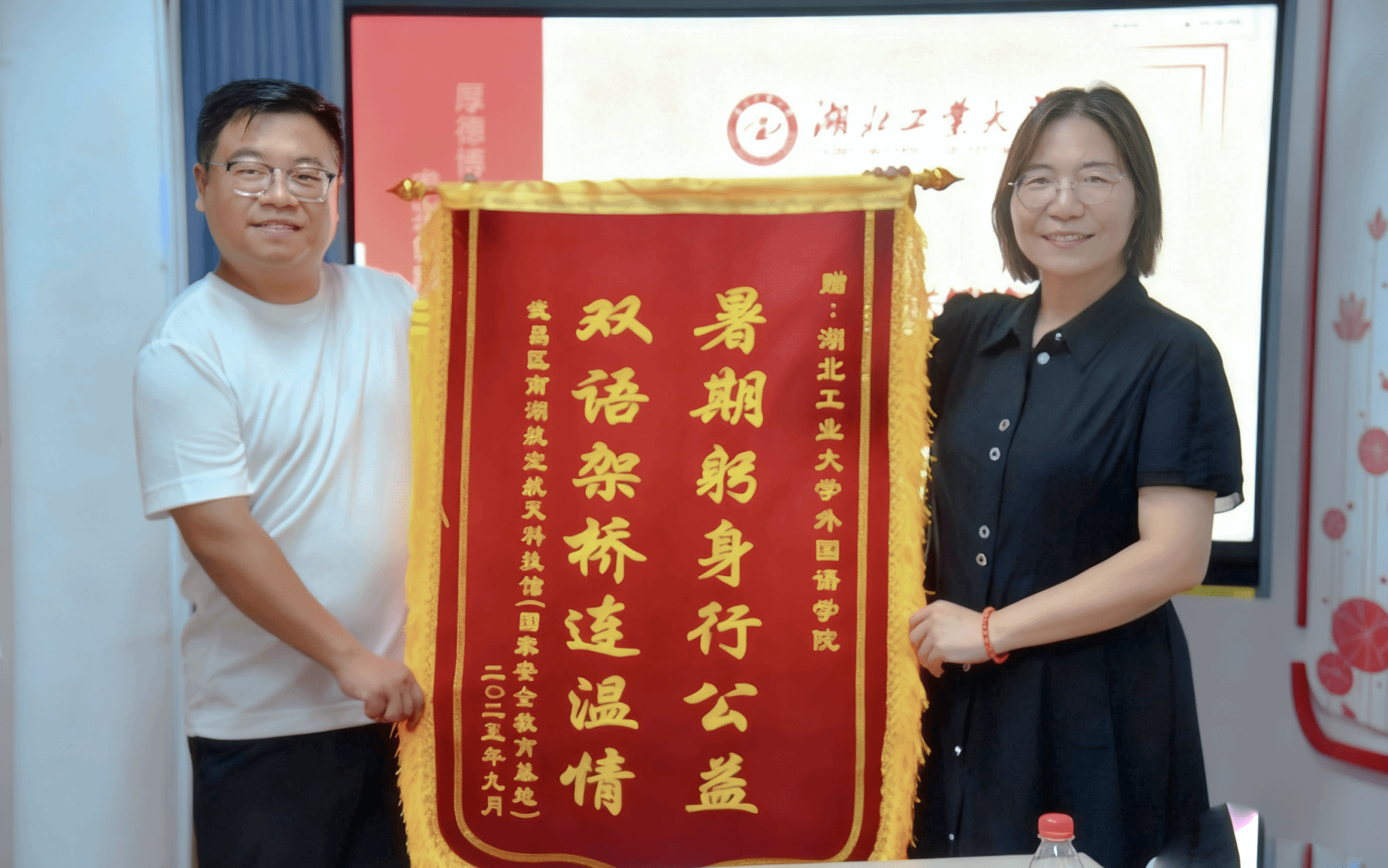 9月12日下午,南湖科技馆馆长谢颖奇一行来校,为外国语学院赠送了3面锦旗,赠送锦旗仪式在学院“红星”学生一站式社区举行。学院院长鲁修红、党委副书记胡文敏、教师代表唐卫红、团委书记曾旗参加仪式。