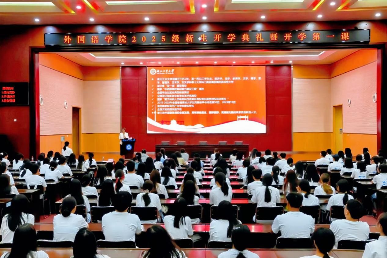 9月24日中午,外国语学院在图书馆报告厅隆重举行2025级本科生及研究生开学典礼暨“开学第一课”活动。学院党委书记张志国、院长鲁修红、副院长黄广芳、李池利,各系部各科室负责人、新生班导师、全体辅导员,以及203名本科新生和69名研究生新生参加了典礼仪式。典礼由学院党委副书记胡文敏主持。