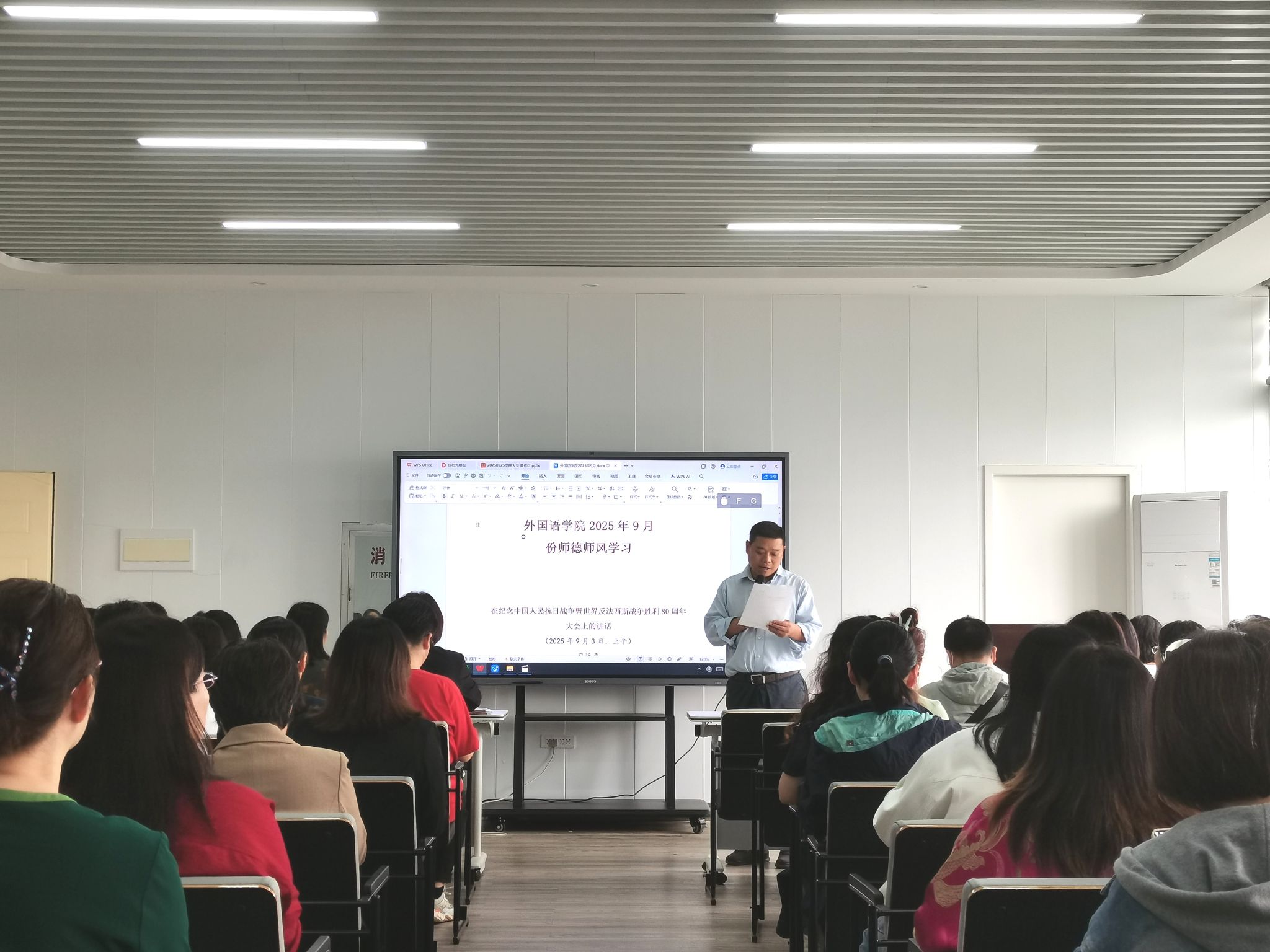 9月25日下午,学院召开全体教职工大会,院党委书记张志国带领全体教职员工集中进行了学习。一是政治理论学习,学习内容:1.习近平总书记在纪念中国人民抗日战争暨世界反法西斯战争胜利 80 周年大会上的重要讲话精神; 2.习近平总书记给全国特岗教师代表回信内容;3.教育部党组书记、部长怀进鹏《学习时报》撰文:以改革创新精神贯彻实施教育强国建设规划纲要;二是师德师风学习教育,学习内容:1.师德楷模先进事迹学习 ,2025年全国“最美教师”浙江海洋大学教授水柏年先进事迹和2025年全国“最美教师”哈尔滨工业大学教授邓宗全先进事迹。2.师德失范行为通报及警示教育:关于上海交通大学教师程某某、徐某涉嫌师德失范行为问题调查处理的情况通报(2025年7月)和关于山东省蓬莱第二中学教师刘某某涉嫌师德失范行 为问题调查处理的情况通报(2025年8月)。
