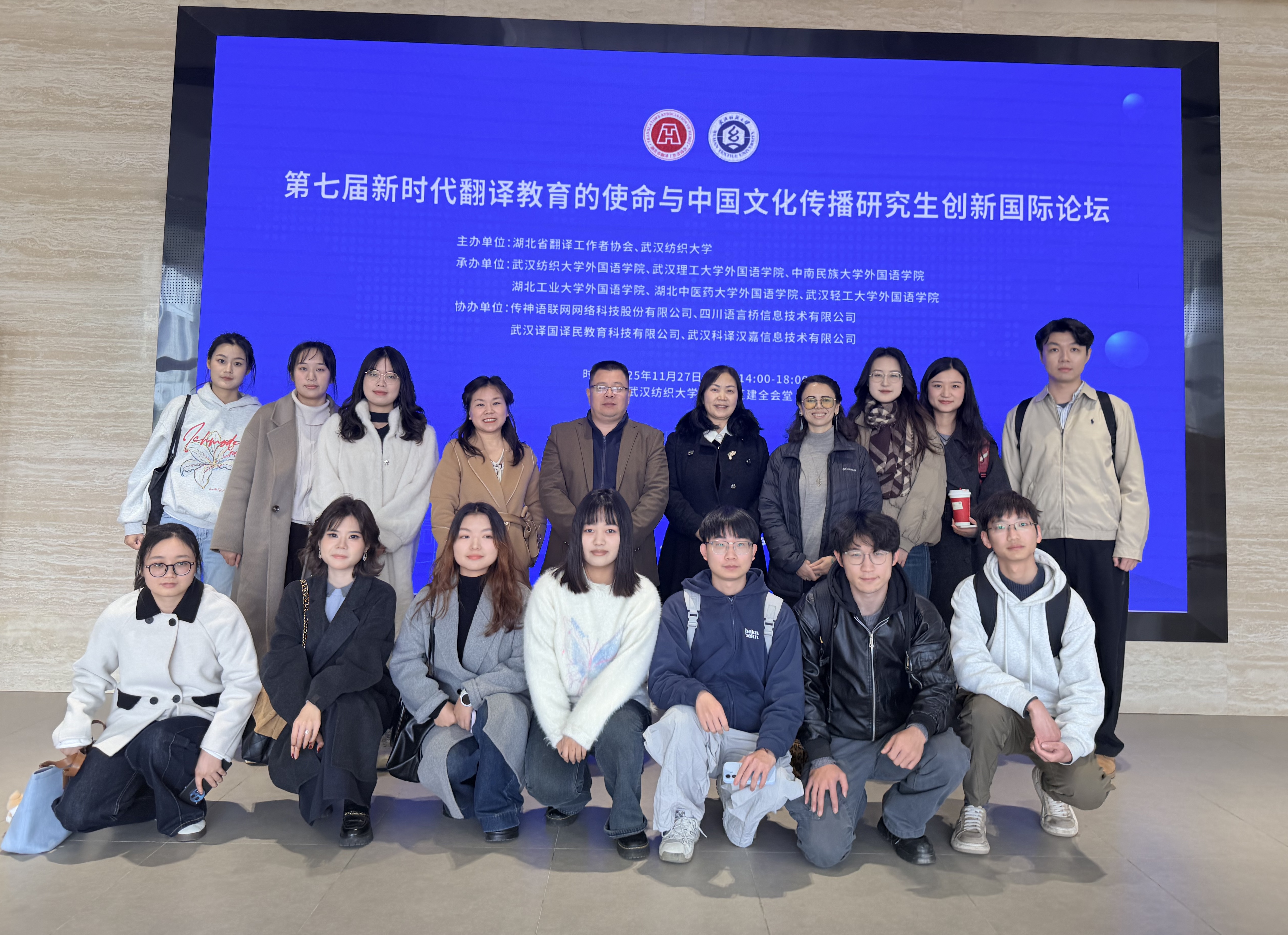 11月27日,由湖北省翻译工作者协会与武汉纺织大学联合主办的“第七届新时代翻译教育的使命与中国文化传播研究生创新国际论坛”在武汉纺织大学顺利举行。作为本次论坛的承办单位之一,湖北工业大学外国语学院积极组织、深度参与学术交流。院长鲁修红,副院长李池利,MTI中心主任肖家燕、副主任涂慧琴,以及外教Rebecca Yoshikane带队,虞灿、陈诗洋等13名MTI研究生参会,围绕“新时代翻译教育的使命与中华文化传播”这一核心议题,展开多角度、深层次的研讨交流。