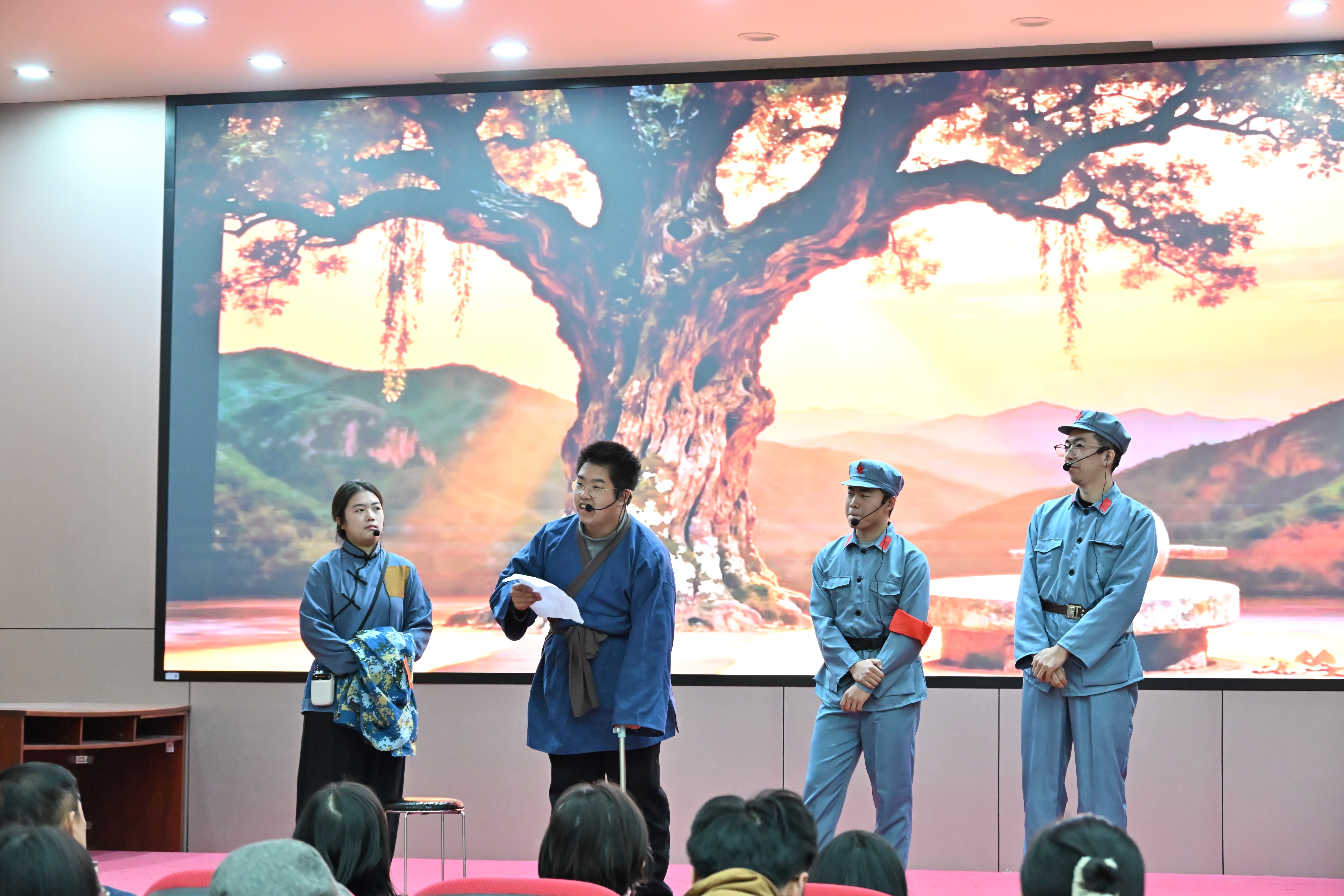 演讲环节间隙,由2024级和2025级本科生原创并自导自演的话剧《胜利之声》精彩上演。该剧生动再现了抗战胜利时刻的欣喜与振奋,以生动的舞台艺术为党史学习教育注入了鲜活的生命力,赢得了全场阵阵掌声。