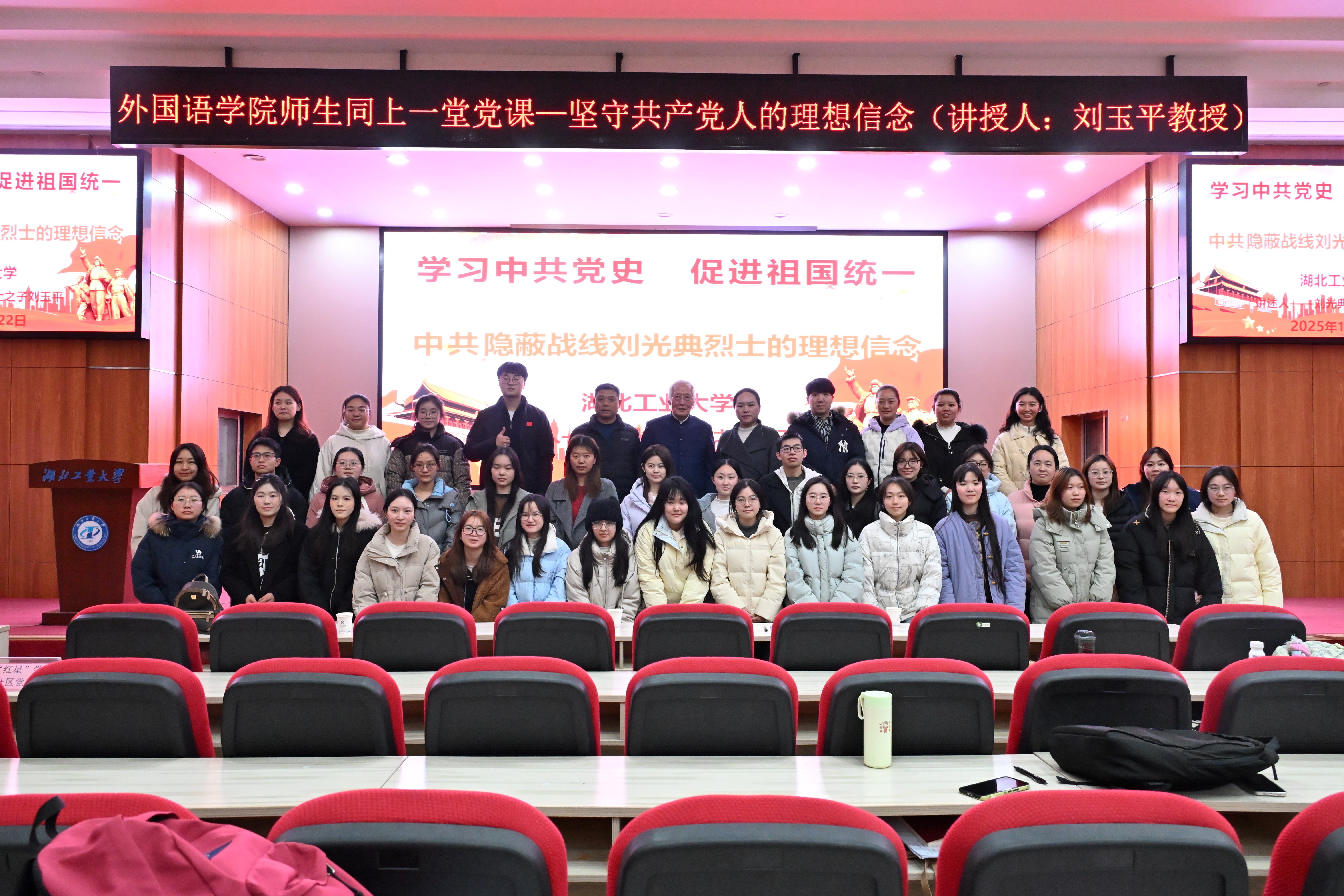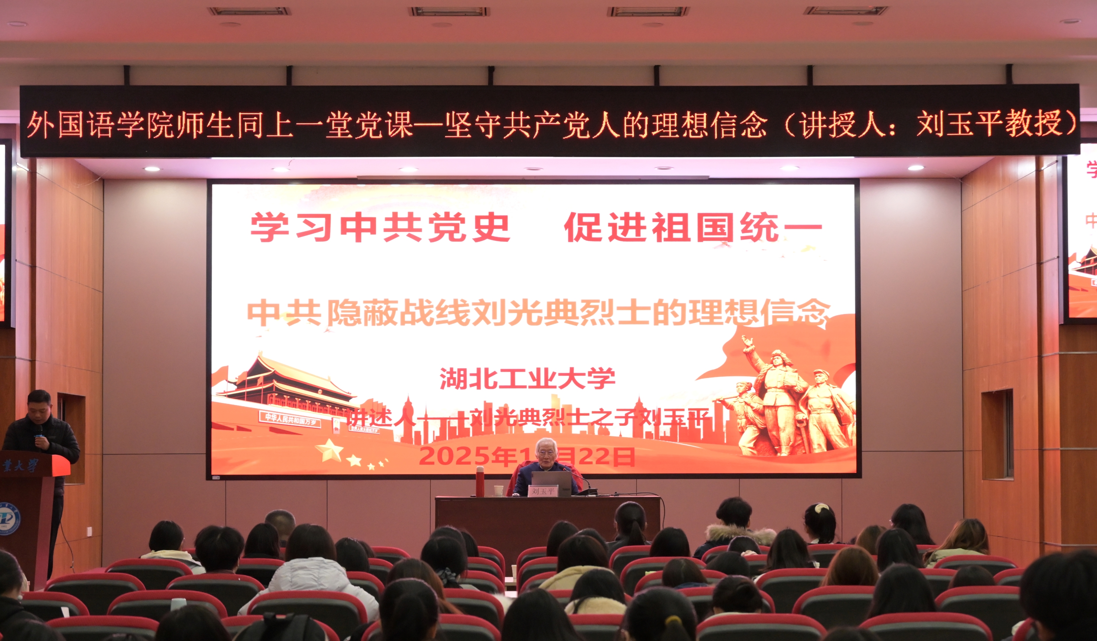 12月22日晚,外国语学院在博学堂举办“坚守共产党人的理想信念”专题党课,邀请了中共中央党校(国家行政学院)兼职教授,教育部高校思想政治工作创新发展中心专家,中共隐蔽战线英雄刘光典烈士之子刘玉平教授担任主讲人。本次党课由学院党委书记张志国主持,党委副书记胡文敏作总结发言。学生工作办公室辅导员张薇、曾旗、黄彦澔、晏晟宁,“红星”学生党支部、学生第一党支部、学生第二党支部全体党员以及2025级学生共同参加学习。
