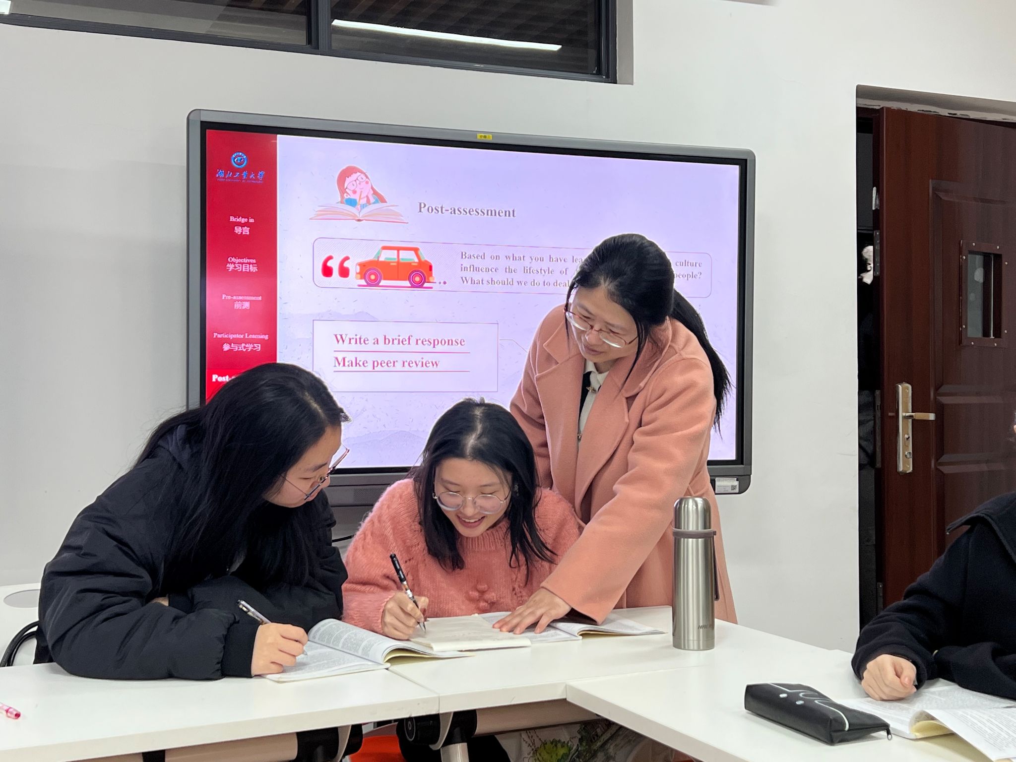 向玉拍板后,团队五人又重新整理视频素材。线上课程添加中国文化部分,讲述中美重大历史事件、教育制度、风俗习惯、交通运输、医疗养老等知识。线下授课则采用情景演绎、翻转课堂等互动形式,以中国视角剖析美国文化,进行文化比较。教学中,向玉会邀请外籍教师进课堂分享他们对中国文化的独到见解,也会邀请学校留学生与中国学生一起在课堂上庆祝中国传统节日。向玉还巧妙地将时事热点融入教学中,鼓励学生用英语进行深入讨论,通过对比分析来提升他们的文化思辨力。例如学生模拟中美领导会晤,引导学生探讨中美大学专业调整背后的动因。