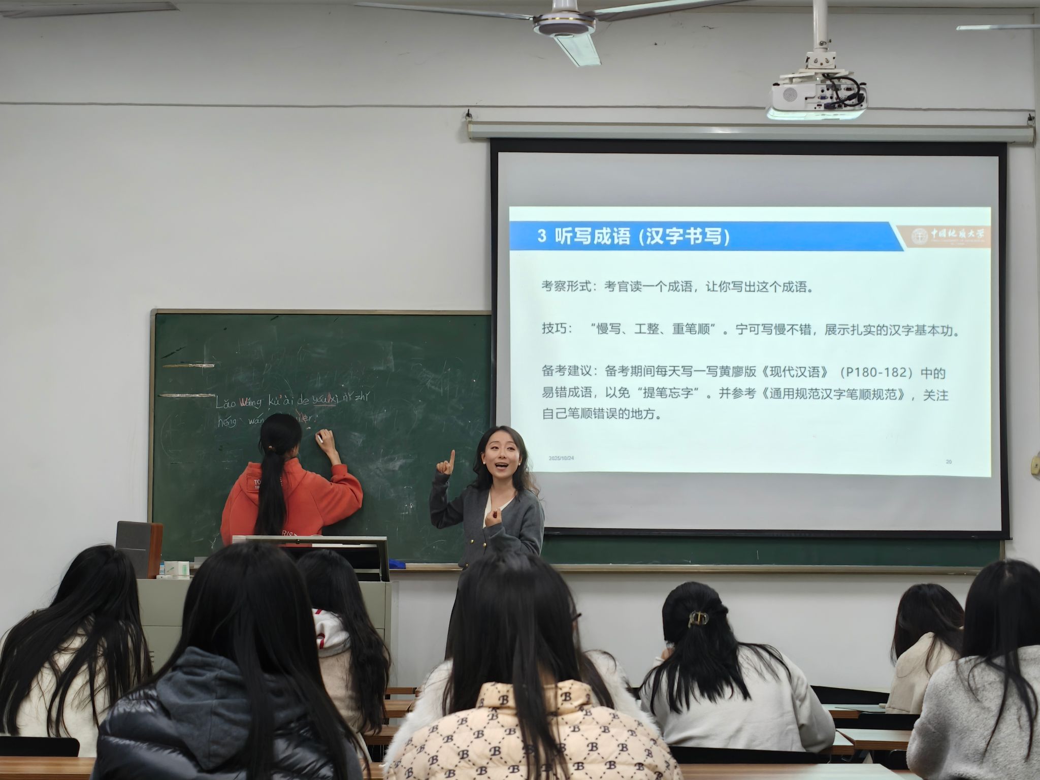 殷思琴老师从理解国际中文教育志愿者的教师、中华文化使者、跨文化交流桥梁、终身学习者与适应者等多重角色内涵出发,引导学生洞悉了志愿者选拔在教学潜质、跨文化胜任力、心理稳定性与韧性、综合素养与使命感等素养的面试标准,重点解析了志愿者面试中五大核心模块的突破策略。在活动中,殷老师结合个人志愿者教师与留学生教学经验,全程采取实战情景模拟与个性化指导方式进行,现场气氛热烈,学生纷纷表示“活动很有趣”“干货满满”!