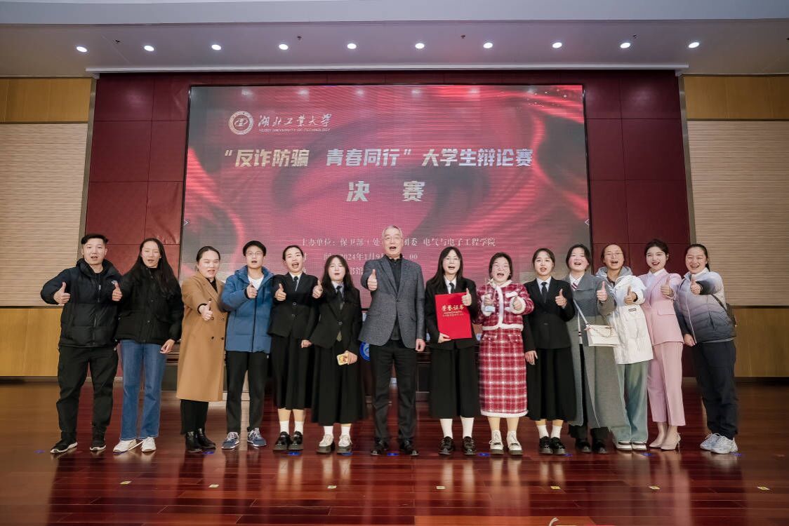 最终外国语学院辩论队赢得比赛,获得了首届“反诈防骗,青春同行”大学生辩论赛冠军。校长冯征为队员们颁奖并合影留恋,他对四位新生辩手的精彩表现予以充分肯定。本场比赛精彩纷呈,会场内座无虚席。通过辩论赛这种安全教育新形式,切实提高了同学们的反诈防骗的意识。