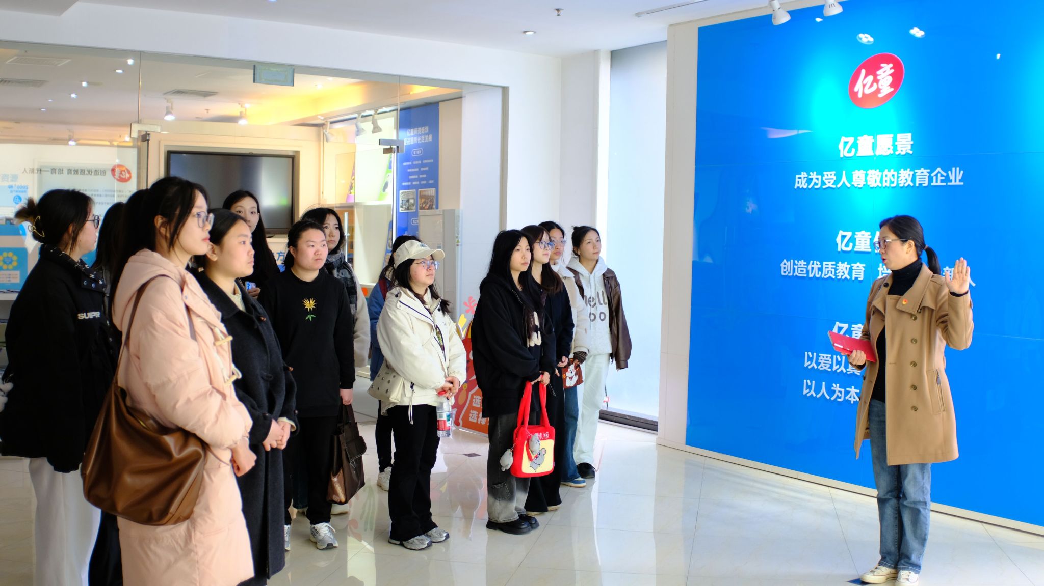 武汉亿童文教股份有限公司党总支书记杨晶晶女士带领大家参观企业文化展厅,详细介绍了亿童二十余年的发展历程和近年来的产品研发成果。设计精巧的教材教具和先进的“亿童幼师云”设备,展现出亿童在幼儿教育产品研发、课程体系建设及教育服务创新方面的深厚积淀与不懈探索,给同学们留下了深刻印象。