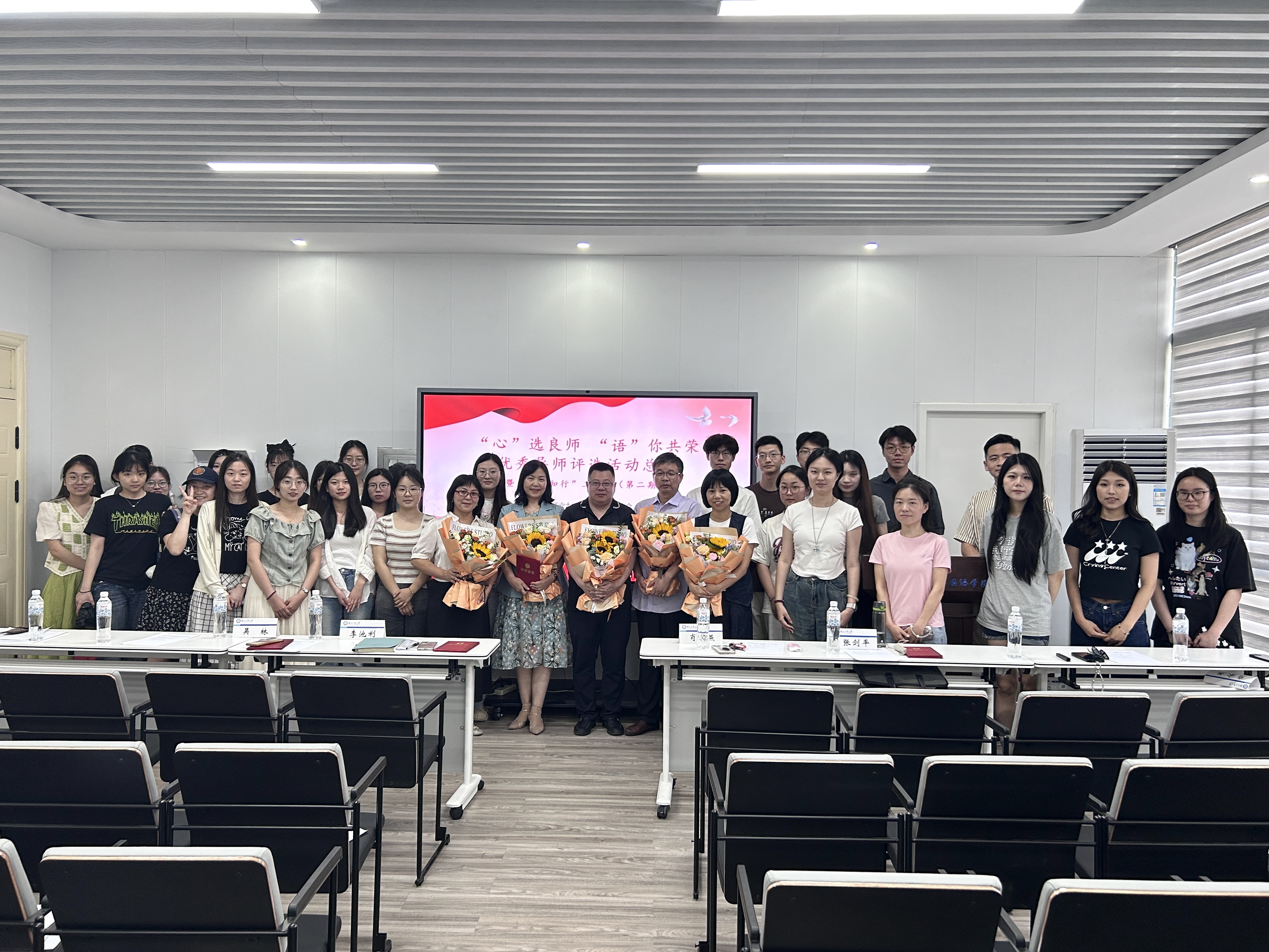 会议伊始,研究生会主席虞灿介绍了“心”选导师、“语”你共荣优秀导师评选活动的背景,宣布了荣获“璀璨星师”“匠心筑梦”和“春风化雨”称号的导师名单。随后,研究生代表为获评的优秀导师献花。