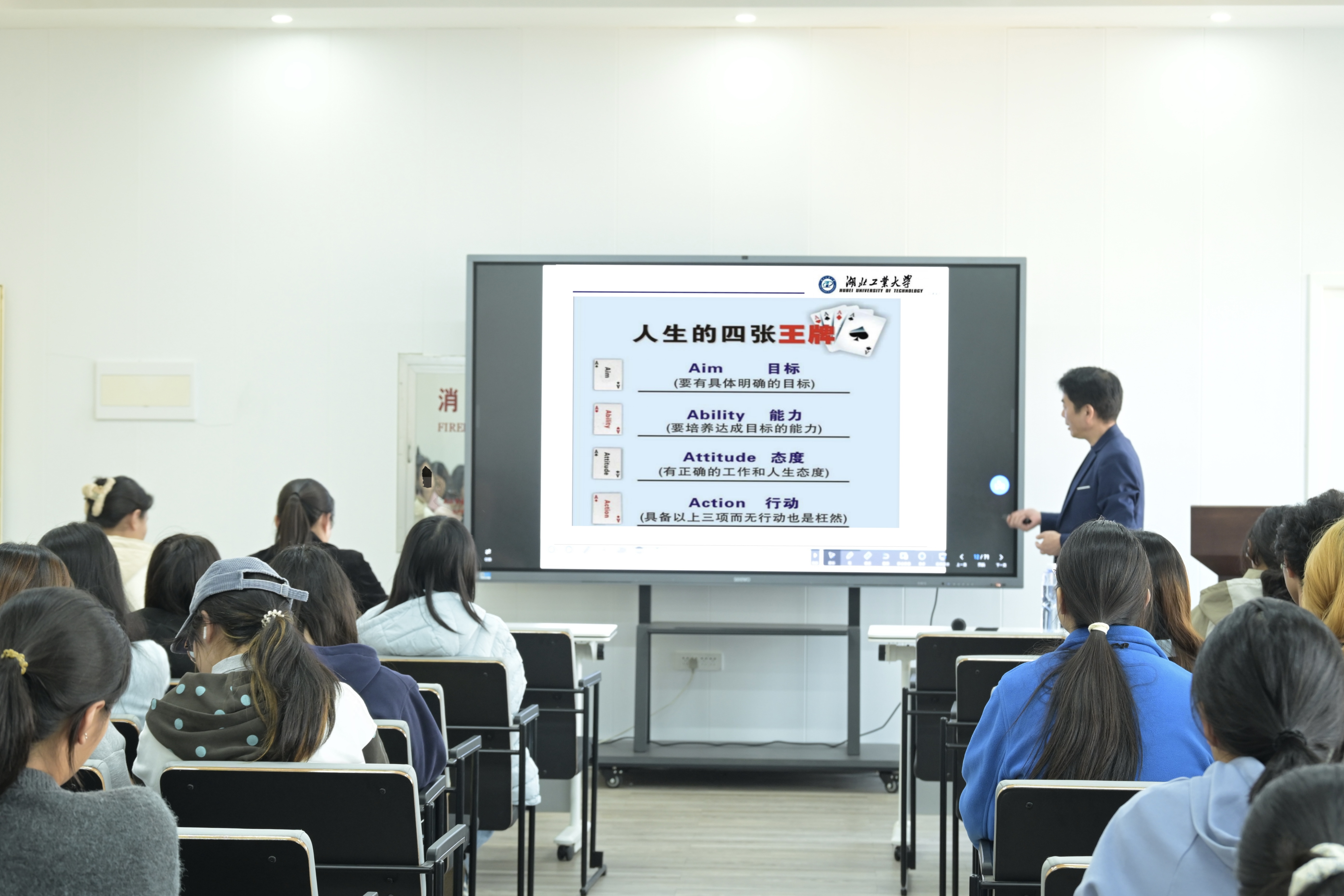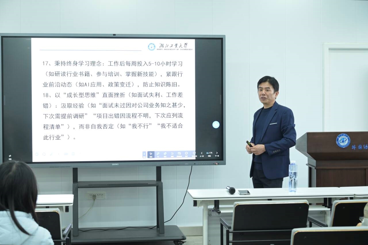 梅林锋校友以“大学生活黄金建议”为主线,结合个人从农村走出、历经建筑、房地产到跨界人工智能的丰富职业经历,分享了他在求学、就业、创业过程中的心得与感悟。他围绕“珍惜大学时光”“树立明确目标”“保持良好心态”“广泛阅读与交益友”“锻炼健康体魄”等方面的话题,为在场学子提供了系统而务实的大学生涯指导。