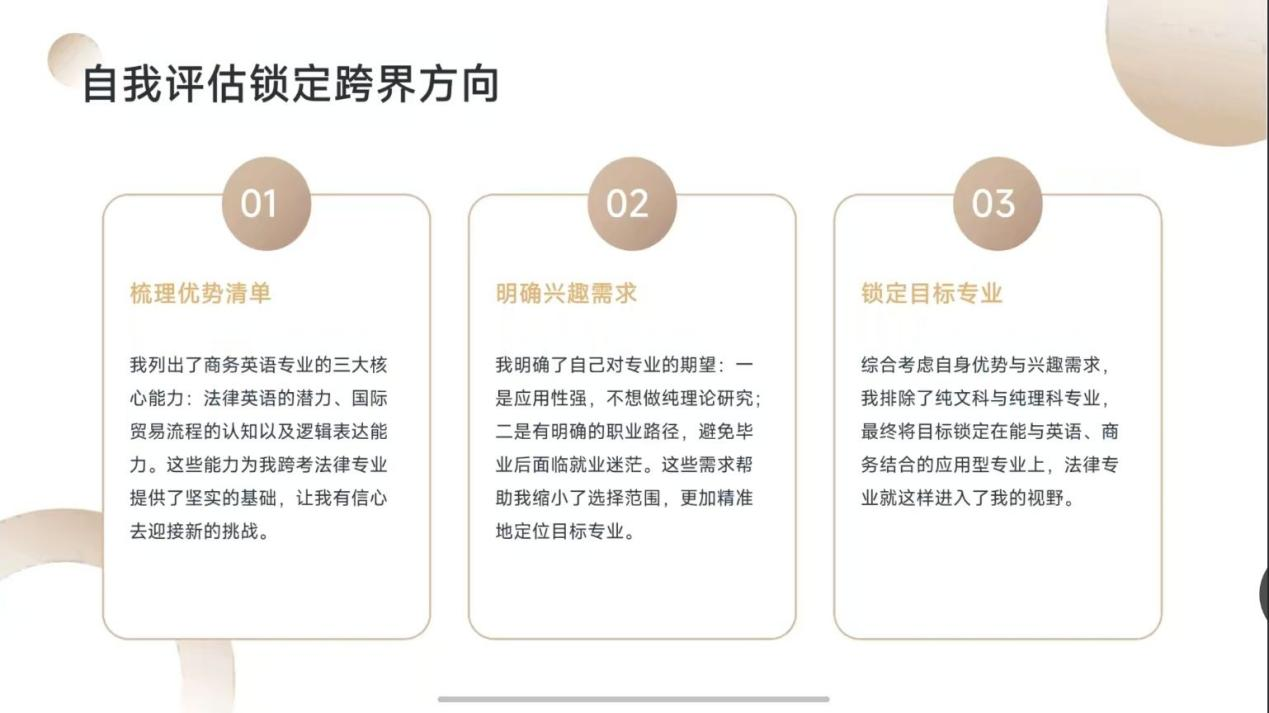 何俪校友在校期间曾担任班级团支书和党支部副书记,曾荣获“最美团支书”、“大学生标兵”等荣誉称号,今年她成功上岸华中科技大学法学交叉专业。分享中,何俪校友以“理性选择+坚定执行”为核心,详细拆解跨考逻辑,并就择校、研究生阶段学习、专业就业方向等方面为同学们传经送宝。在分享的最后,她还寄语同学们不要否定本科专业的价值,它是跨考路上的独特优势,选对方向后,便只顾风雨兼程,走好跨考的荆棘之路,坚信终将通向理想的彼岸。
